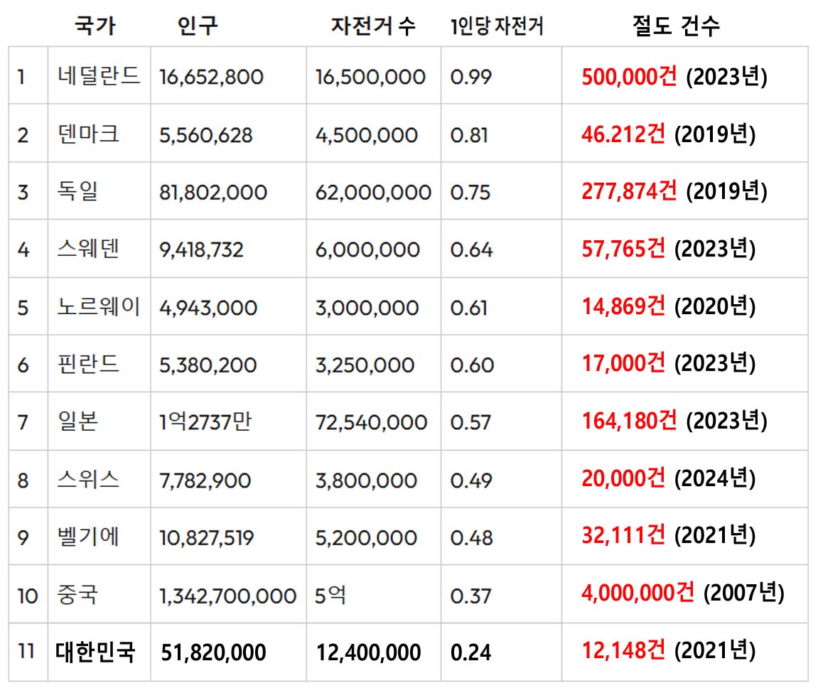 물론 대한민국도 자전거 절도가 있지만, 상대적으로 오히려 인구, 보유대수대비 훨씬 적은것 같은데...
