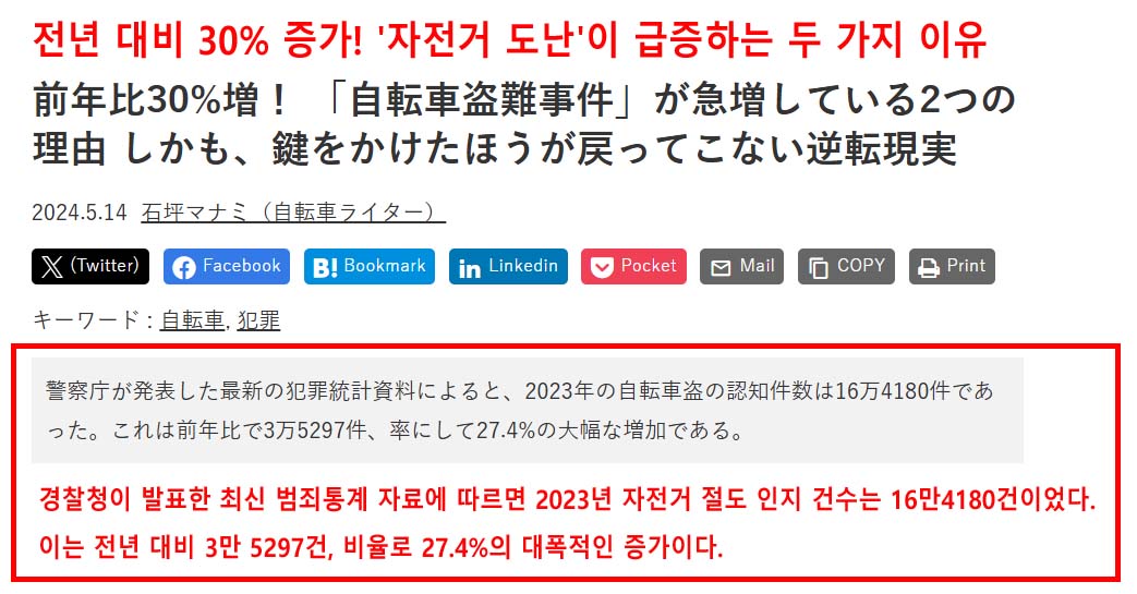 일본은 우리나라보다 자전거 보유대수가 6배 많지만, 절도건수는 14배정도 많습니다.