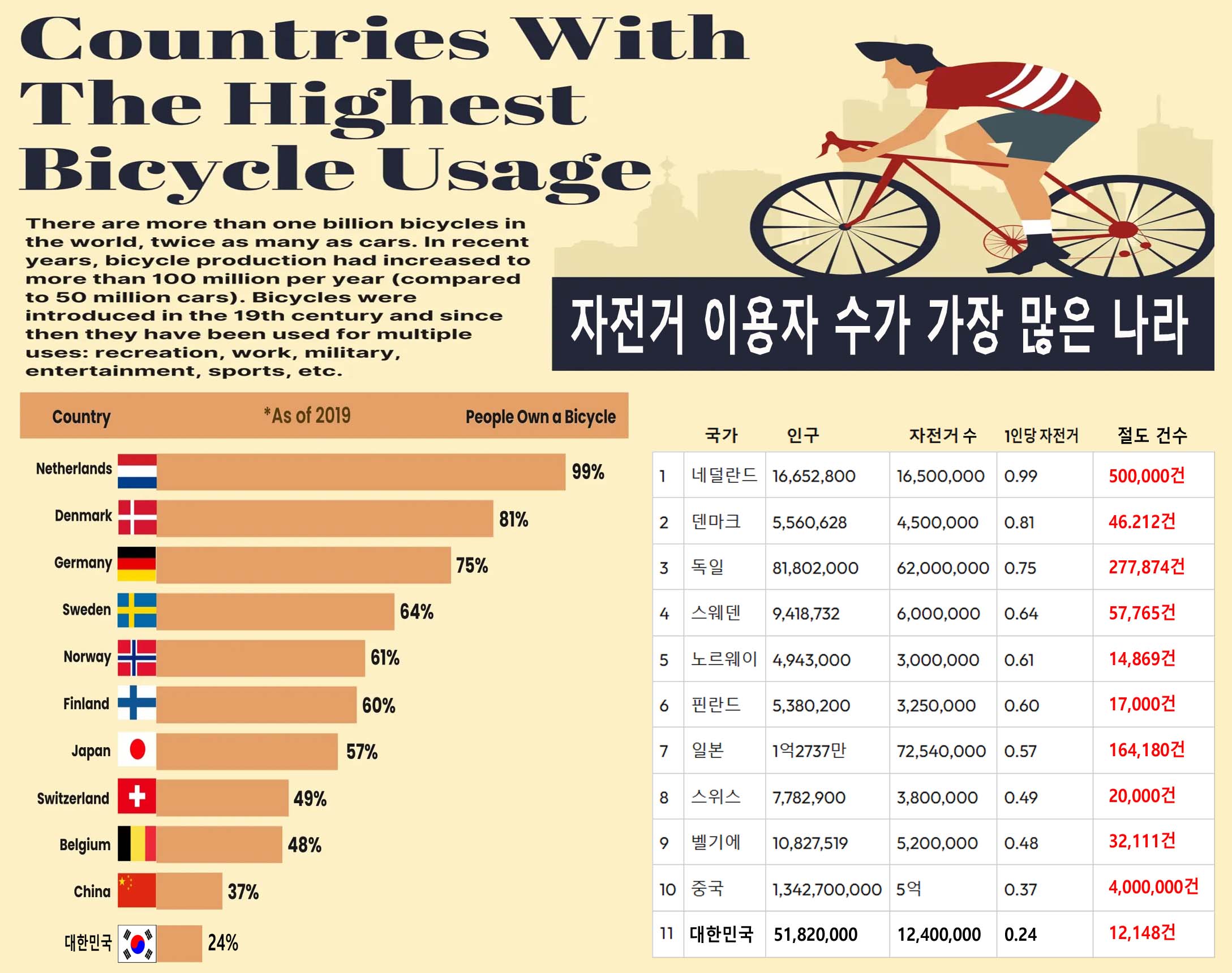 참고로, 인터넷에 이 포스팅의 일부분을 캡쳐해서 많이 돌아다니는데, 그중에는 나라별 자전거 보유대수가 없어서 정확하지 않다는 글들이 많아서 자전거 사용자 수가 가장 많은 10개 국가와 대한민국의 자전거 보유대수를 포함해서 업데이트했습니다.
