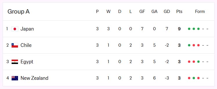 A조: 칠레, 뉴질랜드, 일본, 이집트