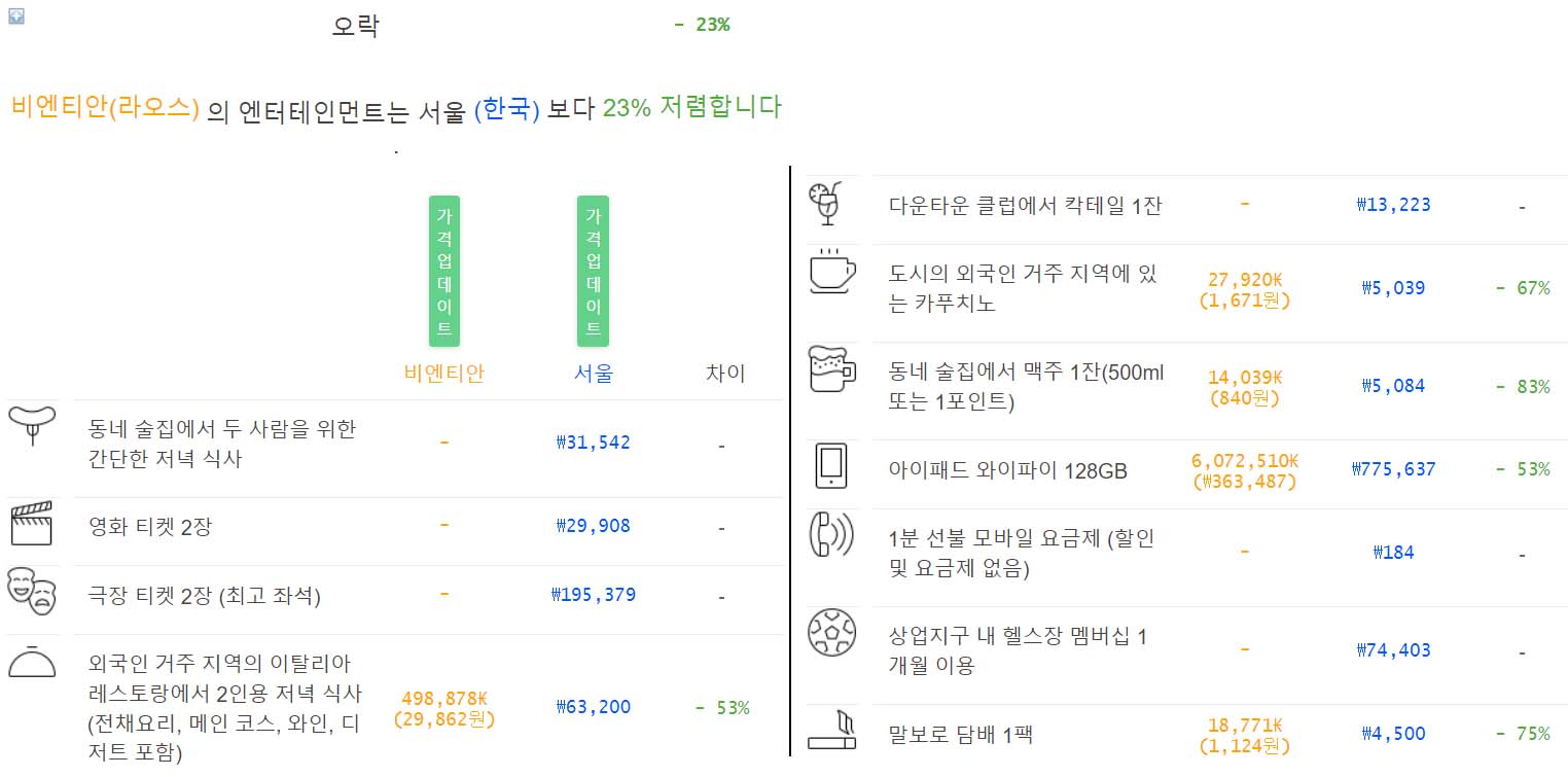 비엔티안(라오스)과 서울의 문화, 여가비 비교